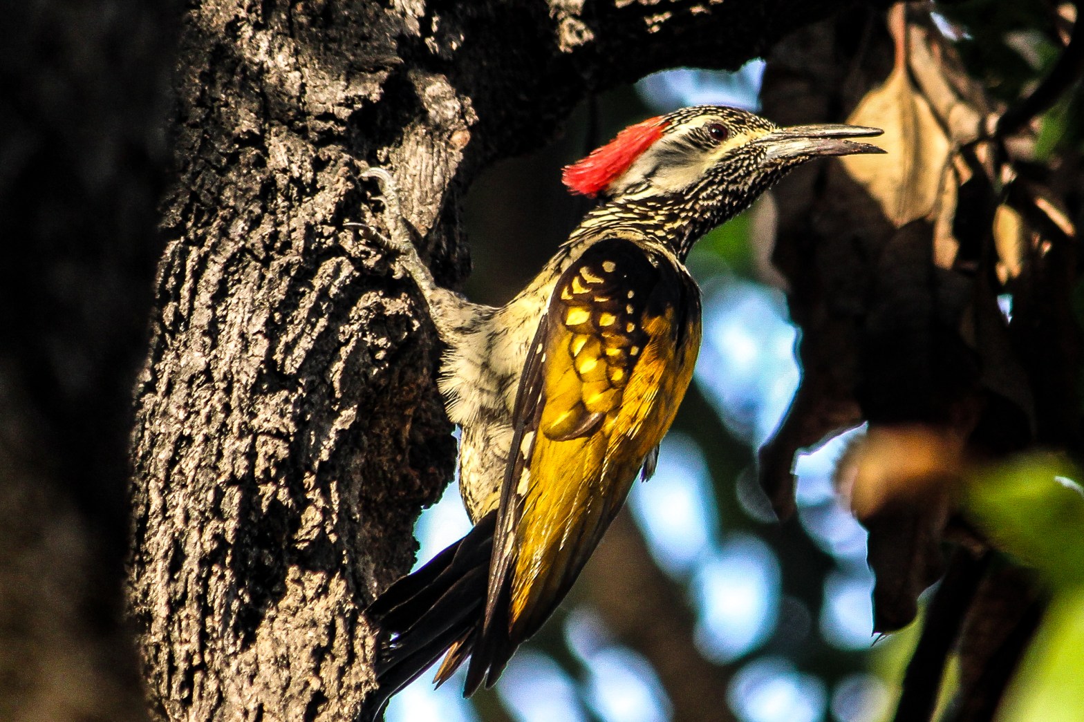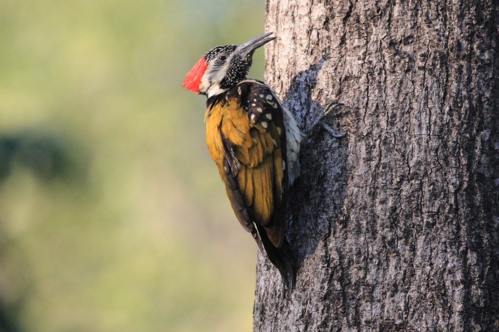 A common, “small-billed” golden-backed woodpecker with four toes. It is one of the few woodpeckers that are seen in urban areas. It has an undulating flight and characteristic rattling-whinnying call “ki-ki-ki-ki-ki,” which steadily increases in pace and ends in a trill.