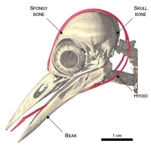 An adaptation unique to woodpeckers is their tongue arrangement. The tongue, consisting of nine long thin bones in the shape of a Y and covered by muscle, extends from the floor of the mouth along the inner jaw to the back of the head and then wraps over the top of the skull to the level of the nostrils. This very long tongue supported by bone allows the birds to extend it deep into tree crevices to search for food.