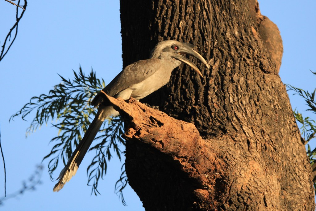 The breeding season of the bird lasts from March to June. The bird begins to display courtship behaviour in January, with the male offering the female different food items to woo her. Their breeding season commences in March. To nest, these birds use natural cavities or holes) in tall trees such as Gulmohar, Neem, Peepal, Banyan, or Jamun. The female hornbill enters the coater of the tree and seals its entry with her excreta and mud provided by the male. She would remain inside for around two to two and half months, leaving only a small, vertical crack in the opening, around 2-3cm wide and 7-8cm long.