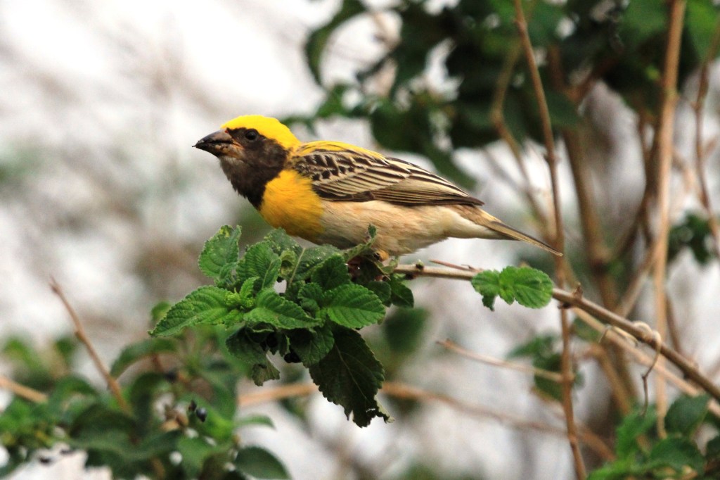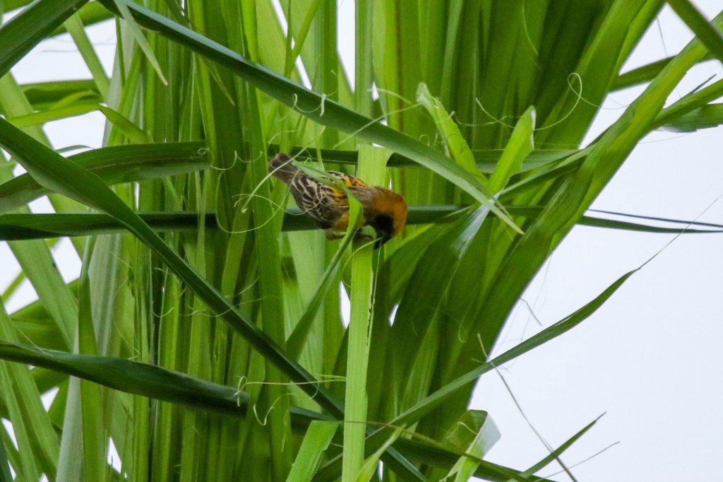 Male Baya Weaver collecting nesting material from Palm Tree leaves