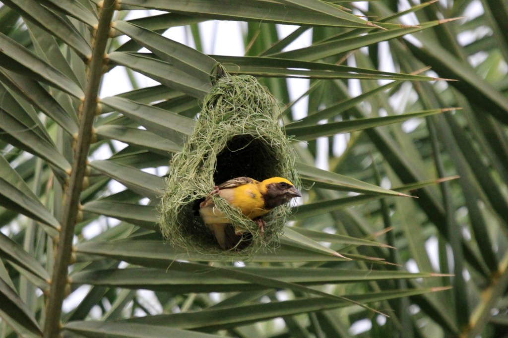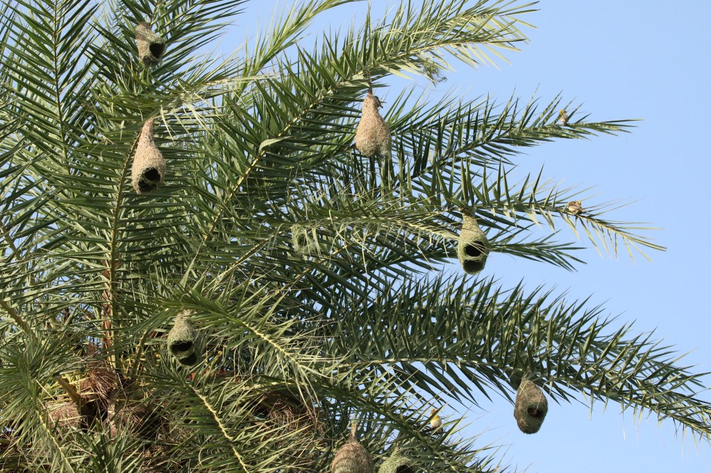 These birds build their nests on almost all species of palms that grow tall. One of the obvious reason is safety. Predators such as snakes cannot climb a thorny shrub or a hanging nest. Hence, such nests provide safety for the eggs and young ones. Another reason for the choice for a nesting colony would be partly dictated by quick access to nest material. The male baya weaver collects 500 to 600 different strands of grass to craft a nest. To collect the nest material, it has to head out often, and if these trips are long, there is the risk of pilferage by a neighbour.