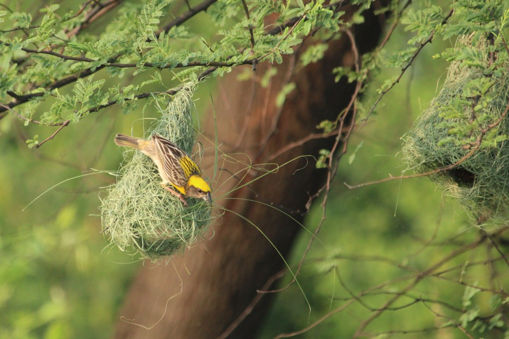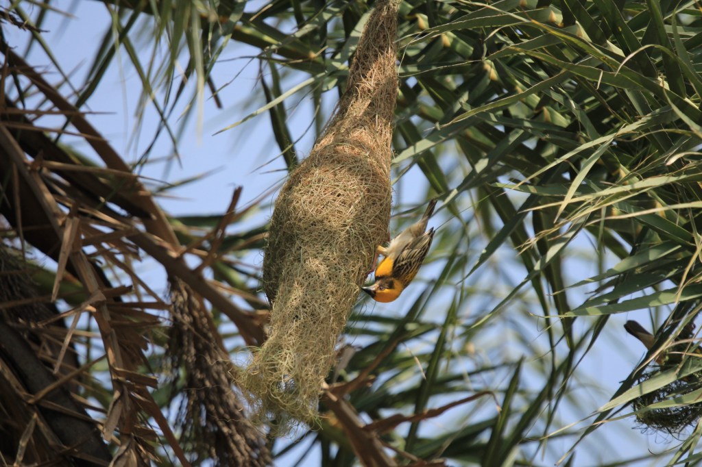 During their breeding season in monsoon, the male birds started to weave the nests with long strips torn from palm fronds, paddy leaves and using the rough grasses. A baya weaver uses its beak and legs to weave and knot. When they weave the nest, the strips are green. He builds a ring and then completes the roof so that the nest resembles a helmet with a chinstrap. Blobs of mud are added to the nest, most probably for reinforcement. It is beautiful to watch them fetching strips, waving them in the air like a dupatta while in flight, and then weaving them meticulously for building a nest.This stage is called helmet stage. At this time the female baya starts visiting the tree in search of a nest and a mate.