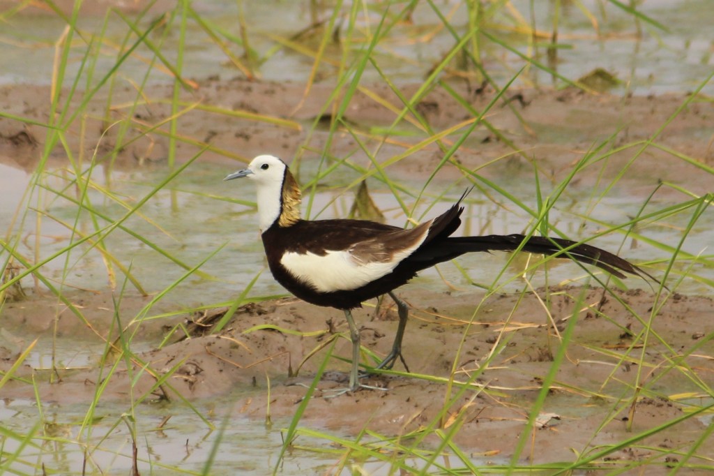 The Pheasant-tailed Jacana is a conspicuous and unmistakable bird. In breeding plumage, the central tail feathers grow very long, resembling a pheasant’s tail, which is how this bird got its common name. On the nape of the neck there is a patch of brilliant, gleaming gold feathers. The wings and under-parts are dazzlingly white in flight in both plumages, as you can see in this photograph. During the breeding season, the long tail adds another 8 cm. Breeding adults are mainly black other than white wings, head, and fore neck. The hind neck is golden. There is a striking white eye-stripe. The legs and very long toes are grey.