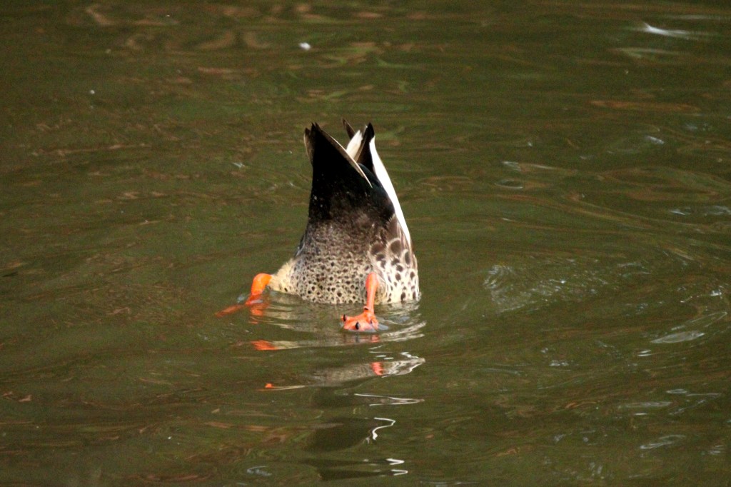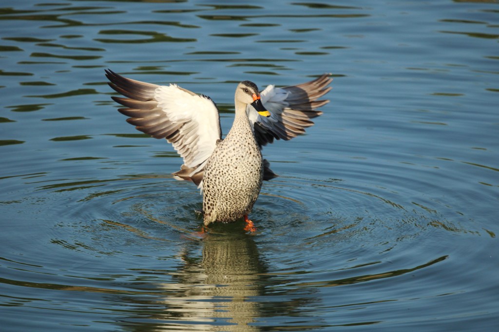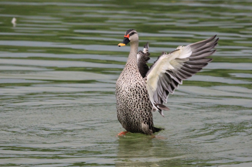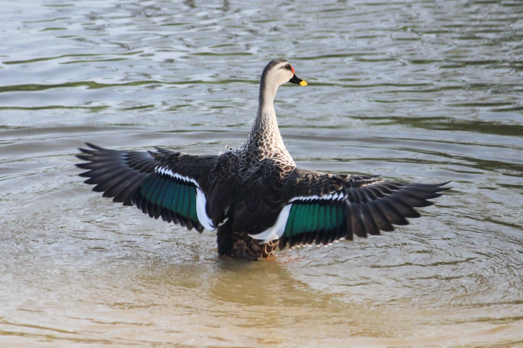 The Indian spot-billed duck is a large duck, which feed mainly at the surface water rather than by diving. The duck is a non-migratory breeding duck throughout freshwater wetlands in the Indian subcontinent. The name is derived from the red spot at the base of the bill that is found in the mainland Indian population.