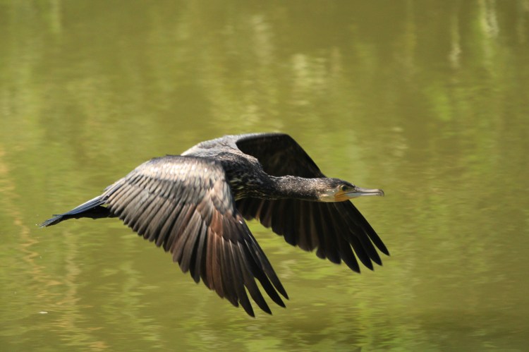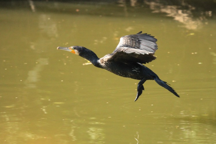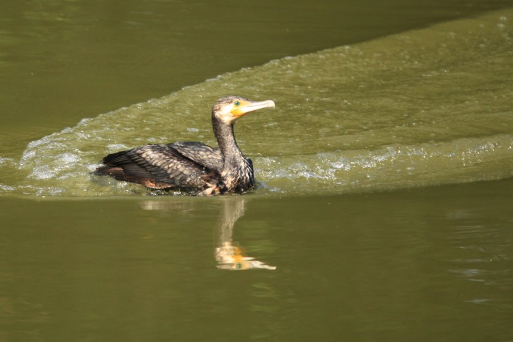 Cormorants are not wading birds, but excellent divers, and underwater they propel themselves with their feet with help from their wings. Some cormorant species have been found to dive as deep as 45 meters (150 ft). A cormorant dives deep in search of fish. It can hold its breath for about 15 minutes (900 seconds). Cormorants dive from the water surface and move underwater with the unique and synchronized paddling of both webbed feet, while wings are folded up against the body. They swim at a speed of 6 to 9 km/h. A flock of cormorants is called a “gulp.”