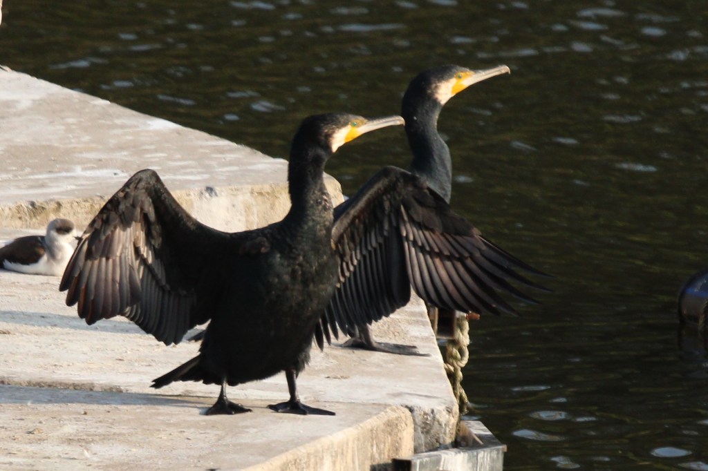 It is often seen with its wings spread for drying after it had been diving for fish. After fishing, cormorants go ashore and are frequently seen holding their wings out in the sun.