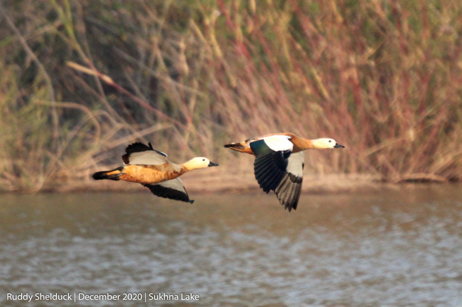 The Ruddy shelduck, known in India as the Brahminy duck, is a winter visitor to Chandigarh. These ducks have already arrived at Sukhna Lake. It has orange-brown body plumage with a paler head, while the tail and the flight feathers in the wings are black, contrasting with the white wing-coverts. It may be due to their saffron color that resembled saffron robes of the Brahmins in ancient India, that these are also known as Brahminy Ducks in India.