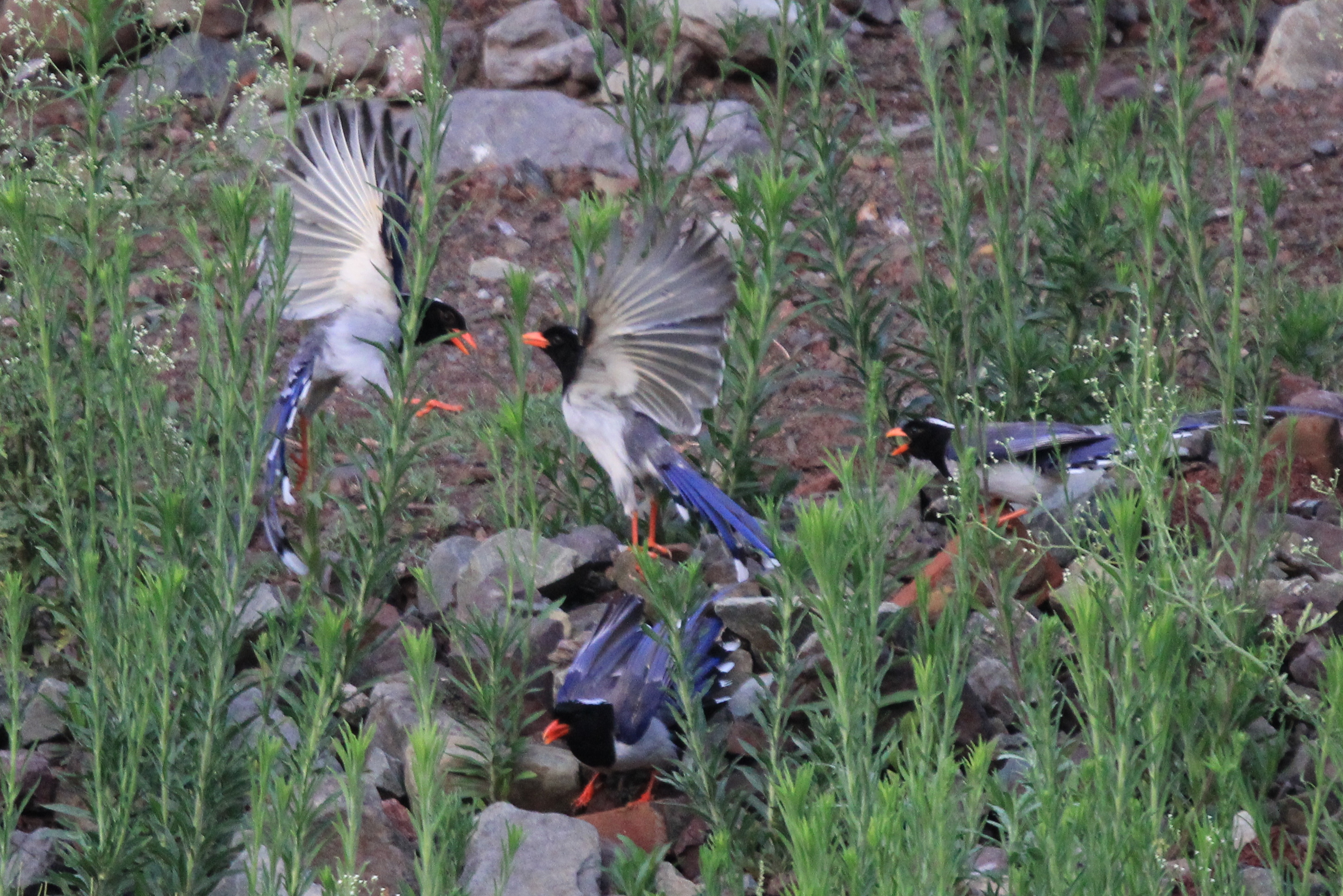 Red-billed magpies are intelligent and interactive birds although they might not be as accommodative as parrots however, blue magpies (red-billed) are equally welcoming and even recognize themselves in a mirror. They are good communicators and communicate via both songs as well as calls. Calls are distinct. Vocal mimicry is evident in this species and its calls are varied with the type of information sent to each other. The blue magpie frequently exchange messages via high pitched whistle or the grating rattle.