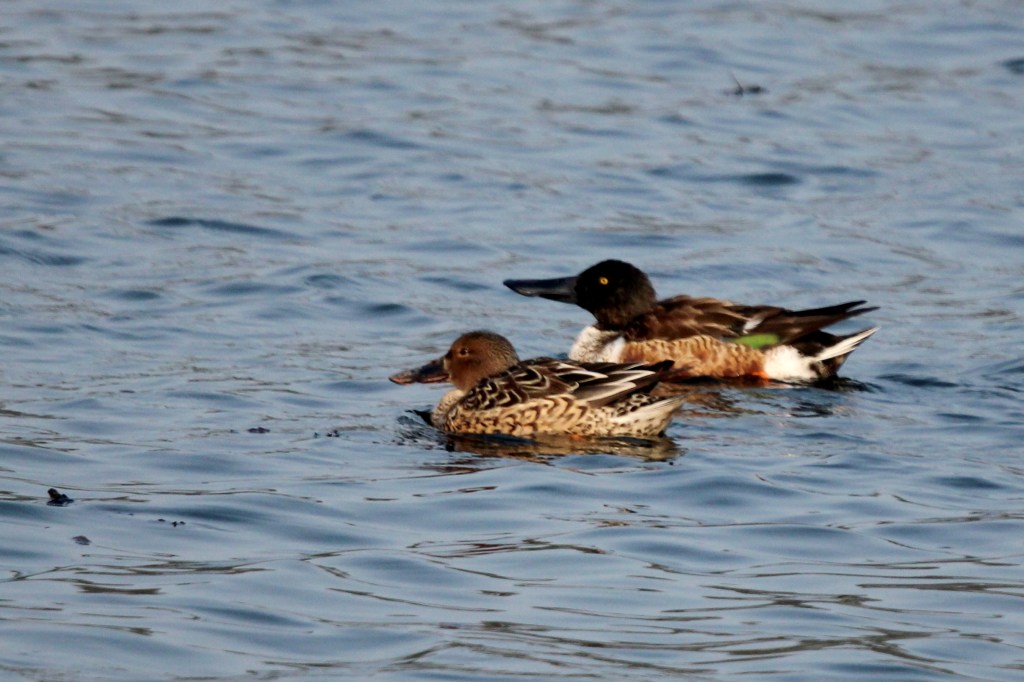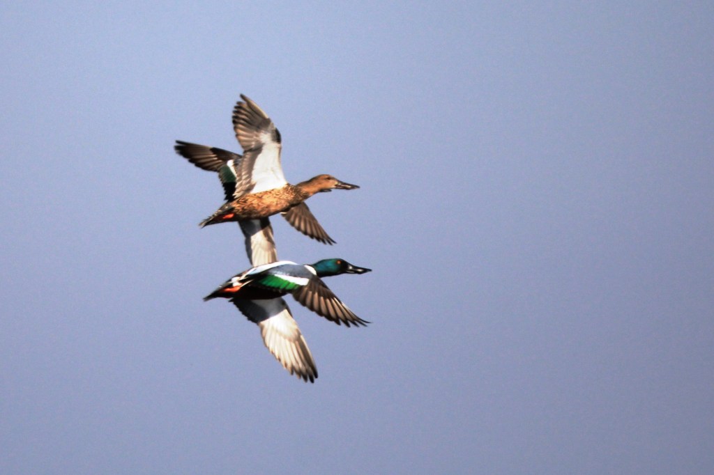 Both males and females have different patterns and colorings. Breeding male shovelers are bold white, blue, green, and rust, but their most notable feature is their white chest and white lower sides. In flight, males flash blue on the upper wing and green on the secondaries (the speculum). Female and immature shovelers are mottled in brown and have powdery-blue on the wings that is sometimes visible on resting birds. Their very large orange bill is their most notable field mark.