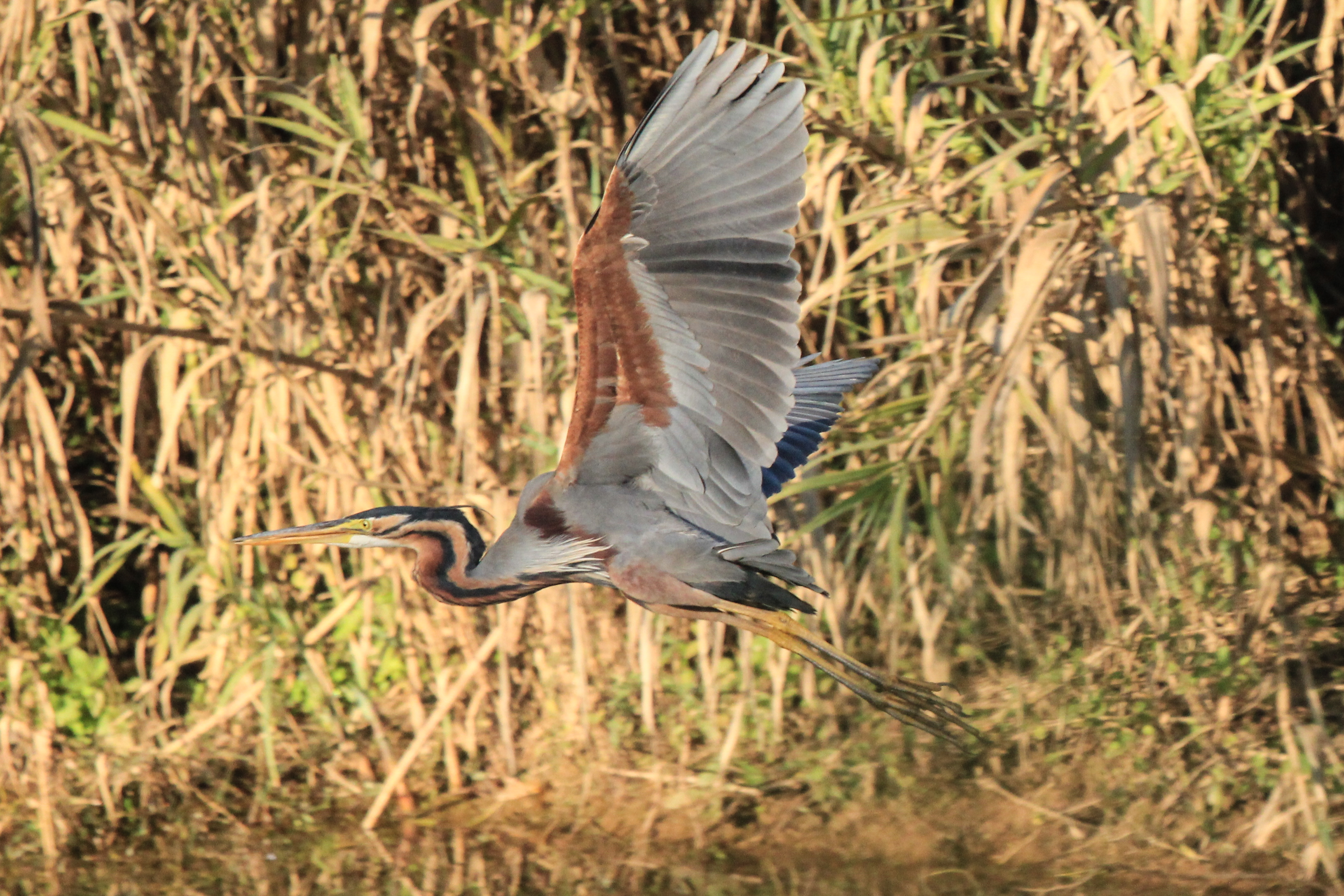 Large heron with rusty head and streaky neck; juvenile is extensively rusty brown on upperparts. Favors fresh marshes with tall reeds and other vegetation. Often more retiring than Gray Heron and rarely seen in open situations