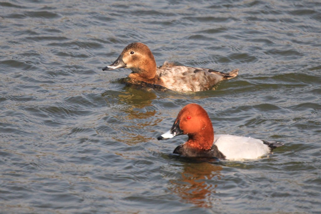 Medium sized diving duck , adult male has a long dark bill with a grey band, a red head and neck, a black breast, red eyes and a grey back, adult female has a brown head and body and a narrower grey bill-band. The triangular head shape is distinctive.