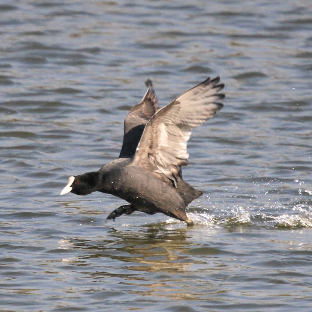 Notable for its slaty black plumage and a lustrous white frontal shield and bill, Eurasian coots are quite reluctant to fly and when taking off, the birds run across the water surface.