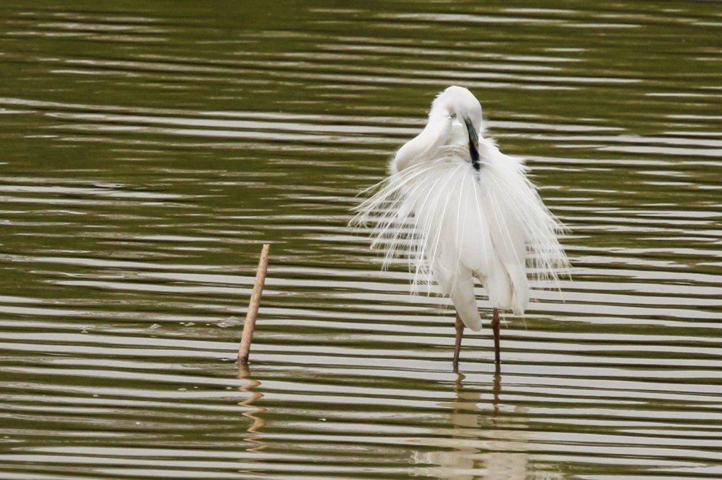 The thin white plumes of the bird’s breeding plumage stand out well against its dark crown and back, and can be very mobile in windy areas.