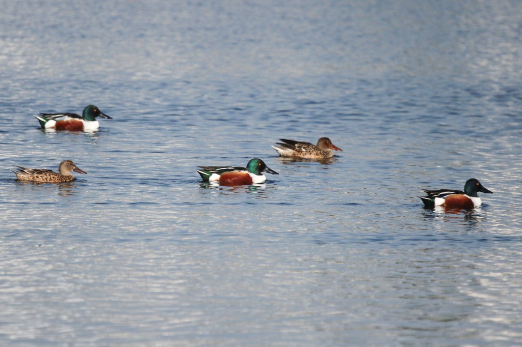 Northern Shoveler – Medium sized duck with its name derived from its highly specialized spoon shaped bill that is used to forage for aquatic invertebrates. Both males and females have different patterns and colorings. Breeding male shovelers are bold white, blue, green, and rust, but their most notable feature is their white chest and white lower sides. In flight, males flash blue on the upper wing and green on the secondaries (the speculum). Female and immature shovelers are mottled in brown and have powdery-blue on the wings that is sometimes visible on resting birds. Their very large orange bill is their most notable field mark.