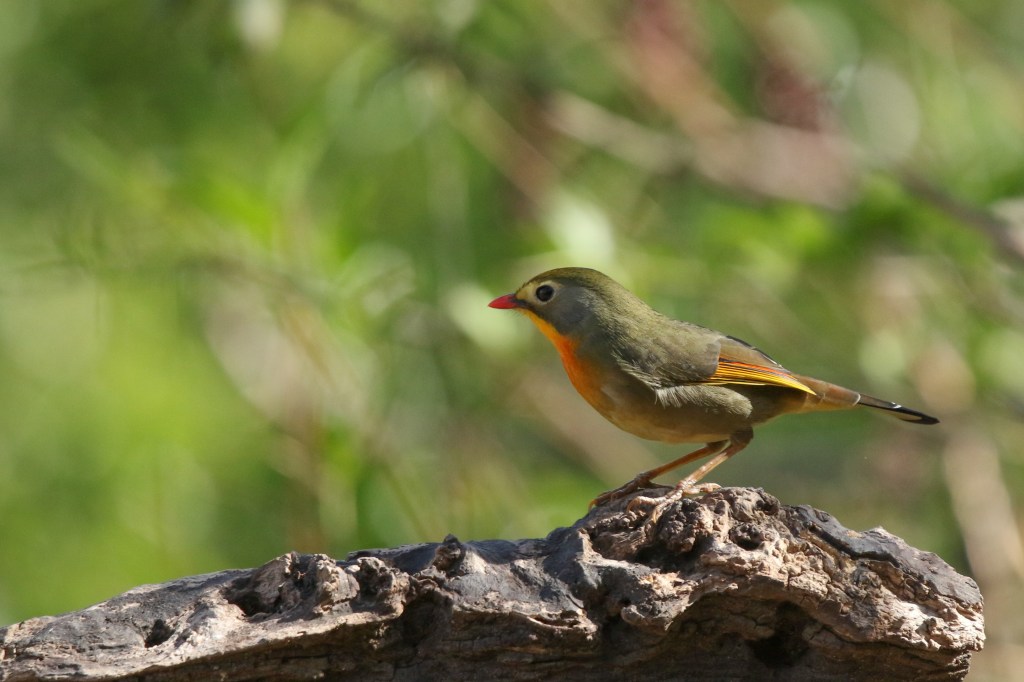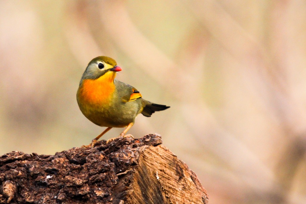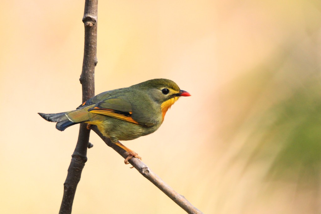 A small but strikingly beautiful bird known for its vibrant plumage, melodious song and active social behavior. The Red-billed Leiothrix, also known as the lipstick bird due to its distinctive striking red bill. It is usually found in small groups of up to 10 birds, which forage together for insects and fruits.