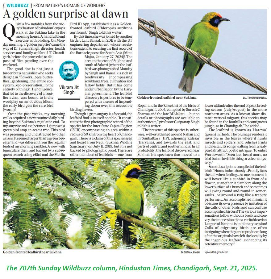 The sighting of Golden fronted Leafbird was beautifully covered and published by renowned journalist and columnist Vikramjit Singh in the 707th Sunday Wildbuzz column, Hindustan Times, Chandigarh edition, of Sept. 21, 2025