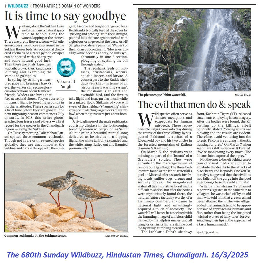 The sighting of Common Red Shanks at Sukhna Lake was beautifully covered and published by renowned journalist and columnist Vikramjit Singh in the 680th Sunday Wildbuzz, Hindustan Times, Chandigarh, of March 16, 2025