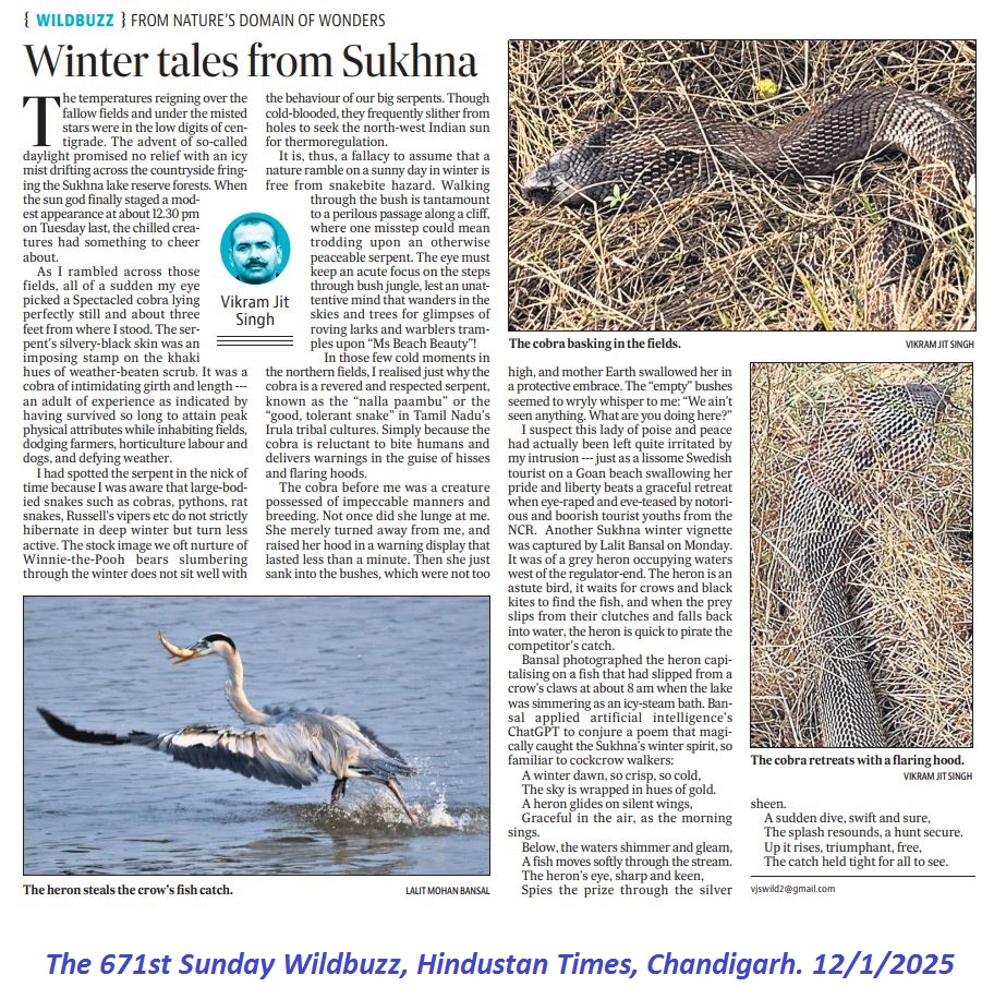 The sighting of Grey Heron catching a fish was beautifully covered and published by renowned journalist and columnist Vikramjit Singh in the 671st Sunday Wildbuzz, Hindustan Times, Chandigarh, of January 12, 2025
